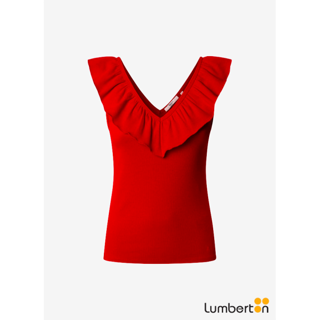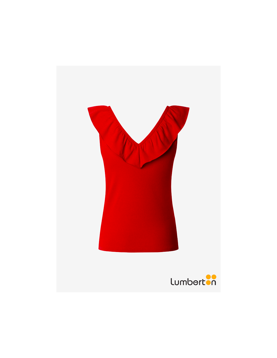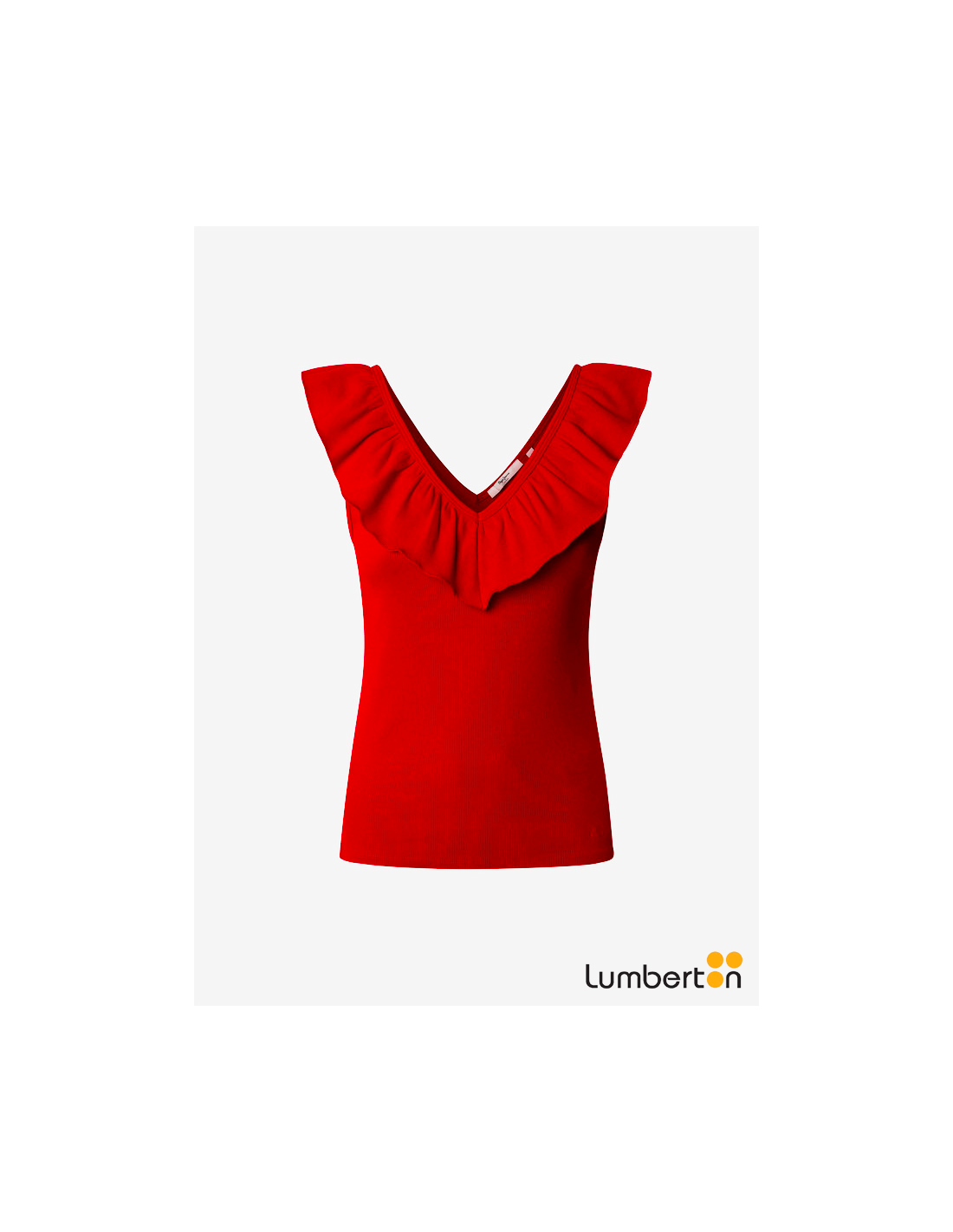 Te encantará esta camiseta roja de volante, ideal para darle un toque romántico y femenino a tu look. Su diseño llamativo y alegre la convierte en la protagonista de cualquier outfit. Perfecta para destacar en ocasiones especiales o para darle vida a tu día a día. ¡Un must lleno de estilo!
