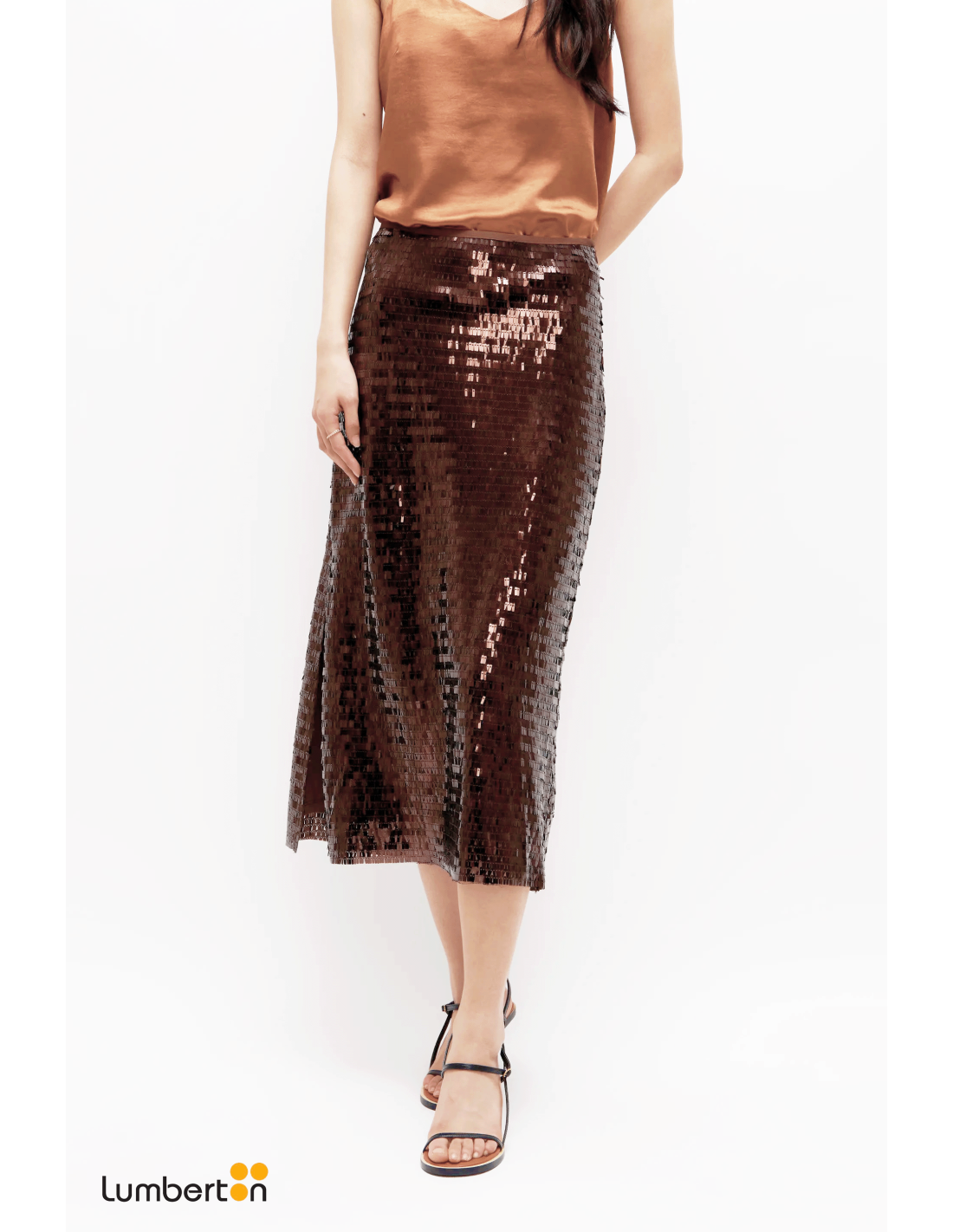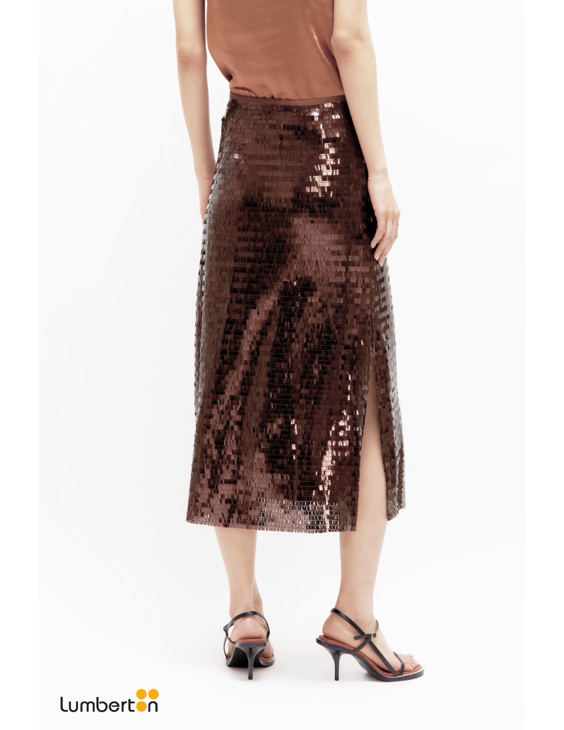 Te encantará esta falda midi de lentejuelas marrón, perfecta para destacar con elegancia y originalidad. Su brillo sutil y corte favorecedor la hacen ideal para eventos especiales o cenas con estilo. Combínala con prendas neutras para un look equilibrado y sofisticado.