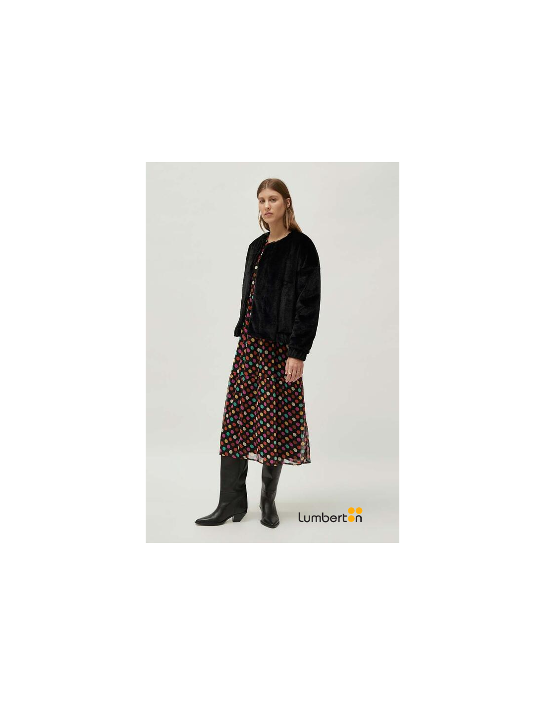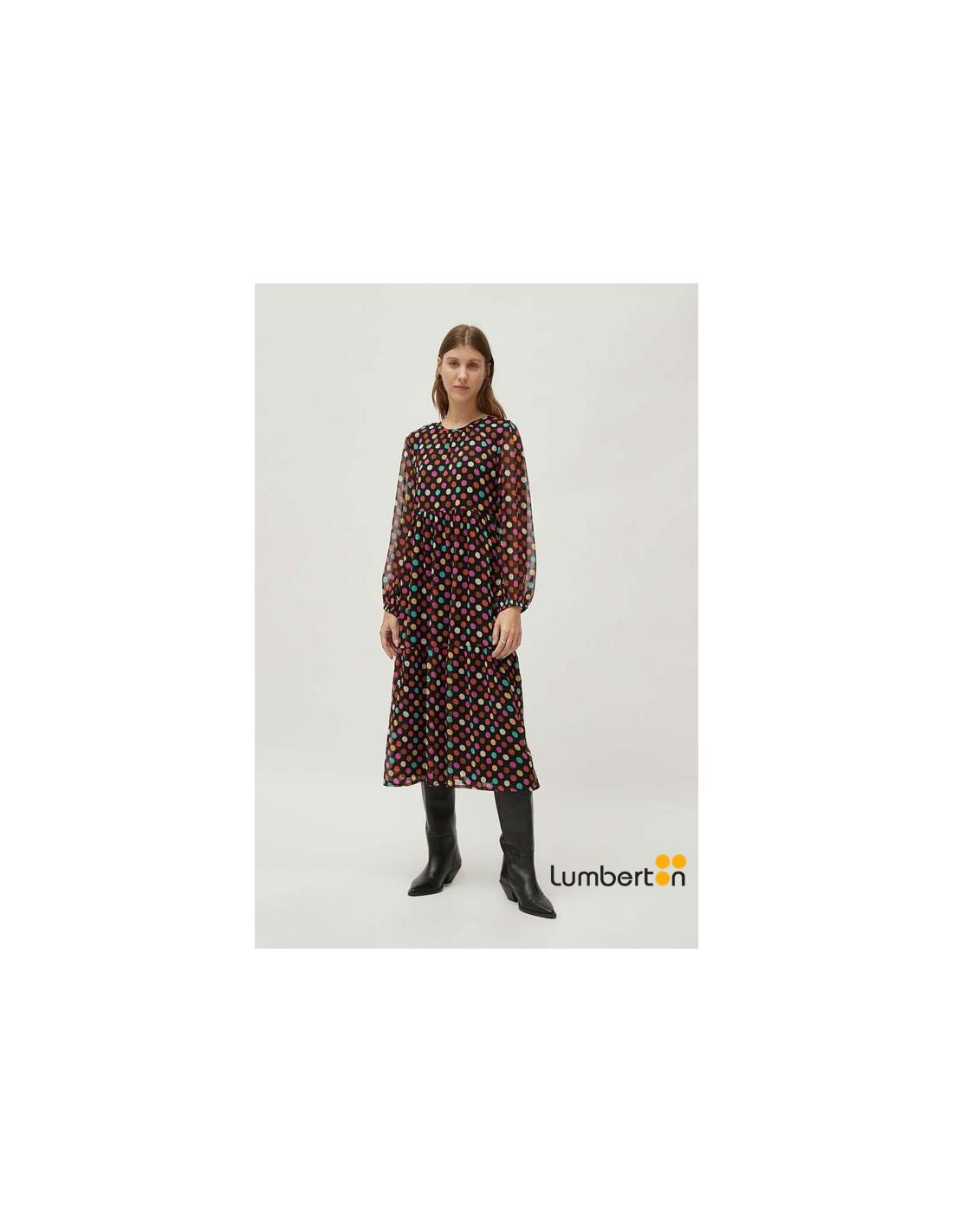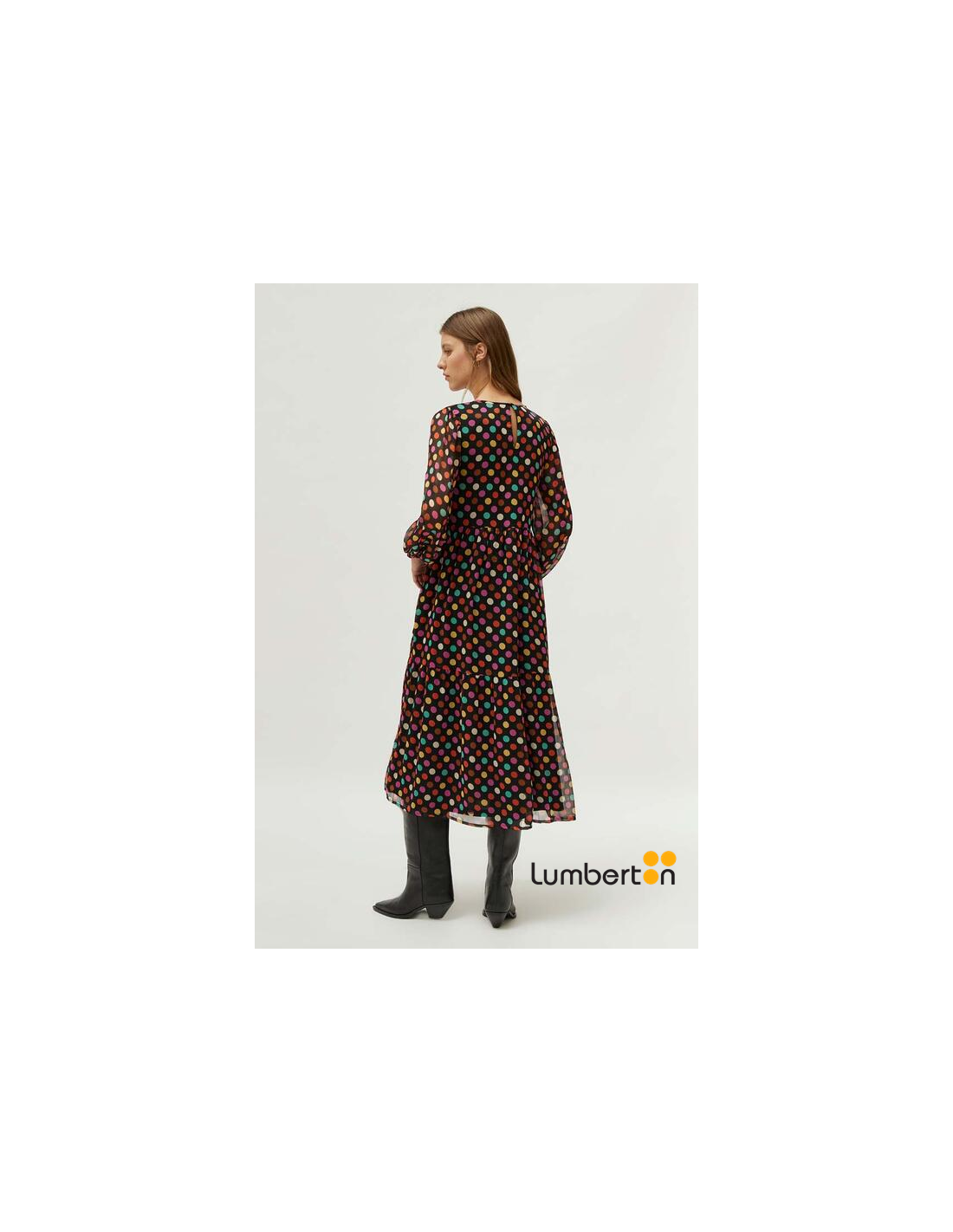 Te enamorará este vestido largo de gasa negro con un divertido estampado de lunares multicolores. Tiene cuello redondo, mangas largas y un delicado botón en la espalda para cerrarlo. Además, cuenta con un elegante corte en la cintura que resalta la figura. Confeccionado con los mejores productes de calidad de la marca Compañía Fantástica.